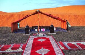 Los camellos estarán listos con un guía para llevarles al desierto de Erg Chebbi, donde disfrutarán de un interesante paseo de una hora. Al llegar al campamento, el equipo les mostrará su tienda de lujo con baño privado.